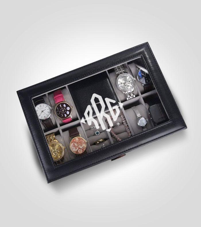 Personalized Black Jewelry Box Organizer for Watches & Sunglasses | Monogram, Style 4